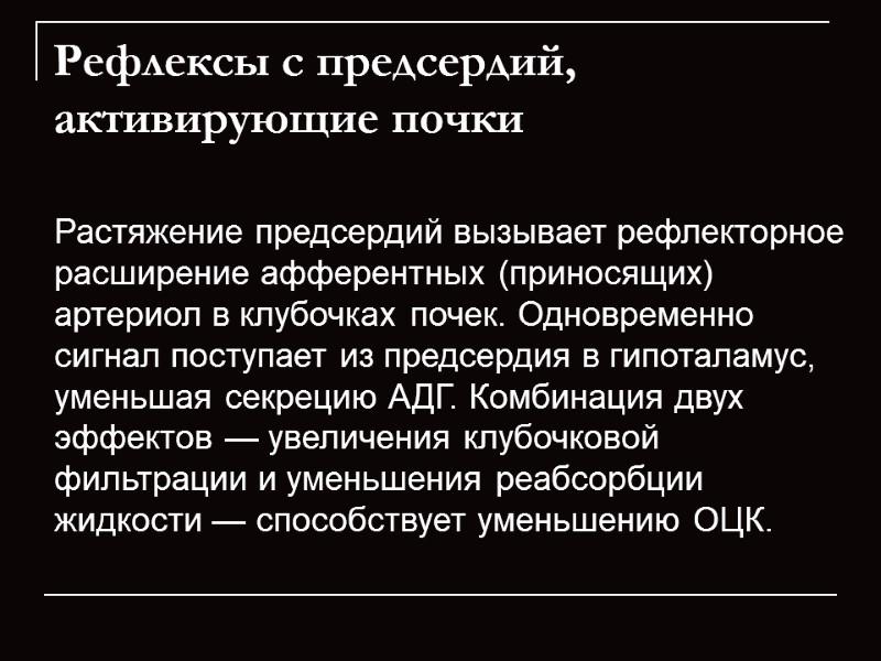 Рефлексы с предсердий, активирующие почки Растяжение предсердий вызывает рефлекторное расширение афферентных (приносящих) артериол в клубочках почек. Одновременно сигнал поступает из предсердия в гипоталамус, уменьшая секрецию АДГ. Комбинация двух эффектов — увеличения клубочковой фильтрации и уменьшения реабсорбции жидкости — способствует уменьшению ОЦК.