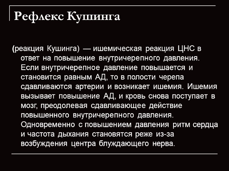 (реакция Кушинга) — ишемическая реакция ЦНС в ответ на повышение внутричерепного давления. Если внутричерепное давление повышается и становится равным АД, то в полости черепа сдавливаются артерии и возникает ишемия. Ишемия вызывает повышение АД, и кровь снова поступает в мозг, преодолевая сдавливающее действие повышенного внутричерепного давления. Одновременно с повышением давления ритм сердца и частота дыхания становятся реже из-за возбуждения центра блуждающего нерва. Рефлекс Кушинга