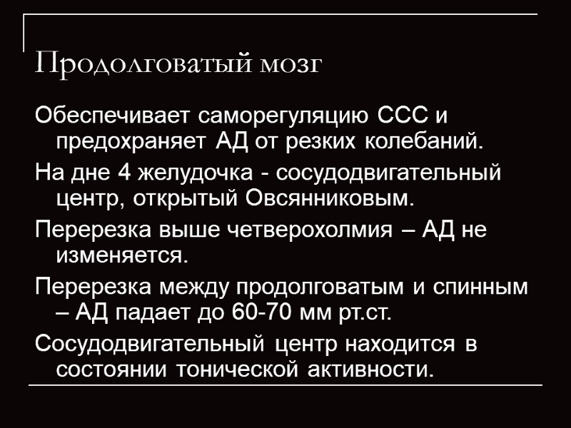 Продолговатый мозг Обеспечивает саморегуляцию ССС и предохраняет АД от резких колебаний. На дне 4 желудочка - сосудодвигательный центр, открытый Овсянниковым. Перерезка выше четверохолмия – АД не изменяется. Перерезка между продолговатым и спинным – АД падает до 60-70 мм рт.ст. Сосудодвигательный центр находится в состоянии тонической активности.