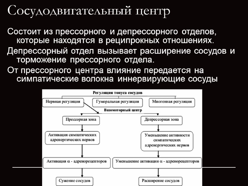 Сосудодвигательный центр Состоит из прессорного и депрессорного отделов, которые находятся в реципрокных отношениях. Депрессорный отдел вызывает расширение сосудов и торможение прессорного отдела. От прессорного центра влияние передается на симпатические волокна иннервирующие сосуды