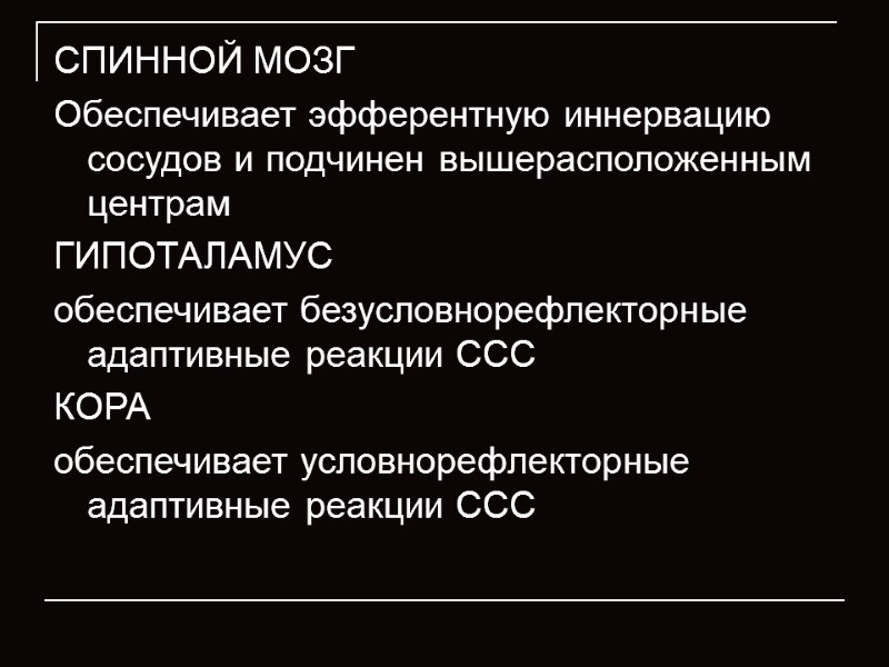 СПИННОЙ МОЗГ Обеспечивает эфферентную иннервацию сосудов и подчинен вышерасположенным центрам ГИПОТАЛАМУС обеспечивает безусловнорефлекторные адаптивные реакции ССС КОРА обеспечивает условнорефлекторные адаптивные реакции ССС