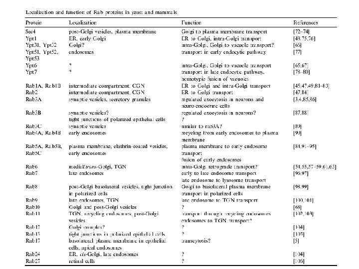 Rab-белки (Ras-related proteins from brain) Малые ГТФазы Компартмент-специфичны: НО: большинство компартментов имеют более чем один Rab- белок Идентифицировано ок. 60 генов у млекопитающих, 11 – в дрожжах высококонсервативны Гипервариабельный домен Высококонсервативный домен + ГДФ: GEF неактивен Нуклеотидсвязывающий карман Остатки геранильной кислоты локализован в цитозоле + ГТФ: активен GAP локализован на мембране