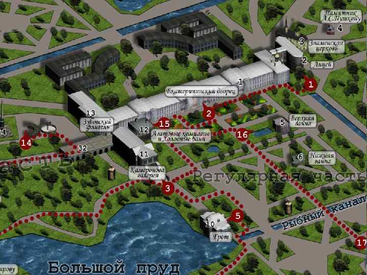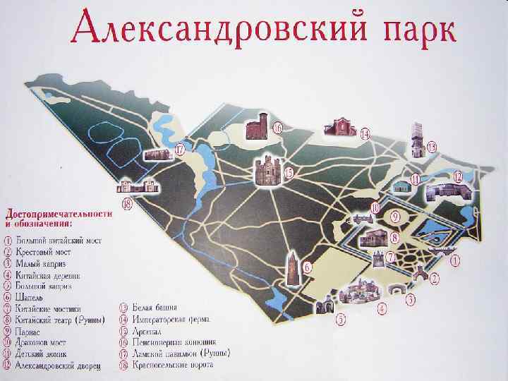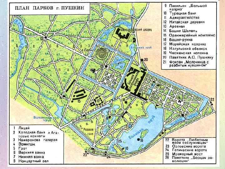 6 Верхная ванна 7 Нижная ванна 8 Эрмитаж 9 Грот 10 Холодная баня 11 Камеронова галерея 12 Собственный садик 13 Адмиралтейство 14 Павильон «Зал на острову» 15 Чесменская колонна 16 Турецкая баня 17 Мраморный мост 18 Пирамида 19 Башня-руина 27 Концертный зал 28 Кухня-руина 30 Скрипучая беседка 20 Орловские ворота 22 Готические ворота 23 Фонтан «Девушка с кувшином» 24 Гранитная терраса 25 Кагульский обелиск