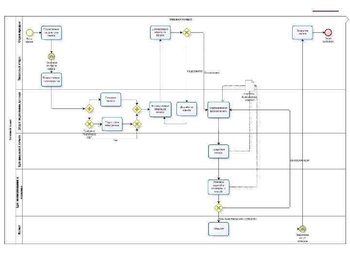 + В какой последовательности нужно осуществлять моделирование БП? 1. Идентификация бизнес-процессов компании Например, термин "производство" подходит для процесса, происходящему от момента закупки сырья до момента отгрузки готовой продукции. Примеры типичных бизнес-процессов в компании: "Разработка продукта" - от выработки концепции до создания образца; "Продажи" - от выявления потенциального клиента до получения заказа; "Выполнение заказа" - от оформления заказа до осуществления платежа; "Обслуживание" - от получения запроса до разрешения возникшей проблемы. • Компания может построить схемы своих процессов так же, как она создает схему организационной структуры. • Сначала выделяются наиболее крупные или основные процессы компании, которые в совокупности и составляют бизнес. • Потом на отдельных схемах каждый крупный бизнес-процесс может быть детализирован до той степени подробности, которая будет необходима.