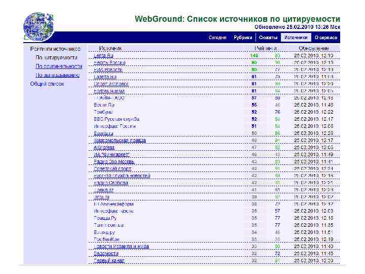 Webscan: pейтинг 100 самых цитируемых онлайн-ресурсов Рунета Рейтинг составлен на основе количества ссылок на соответствующие ресурсы