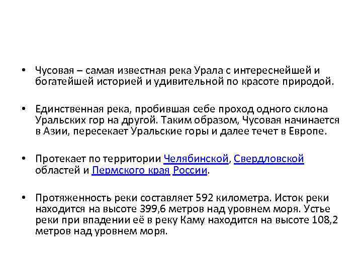• Чусовая – самая известная река Урала с интереснейшей и богатейшей историей и удивительной по красоте природой. • Единственная река, пробившая себе проход одного склона Уральских гор на другой. Таким образом, Чусовая начинается в Азии, пересекает Уральские горы и далее течет в Европе. • Протекает по территории Челябинской, Свердловской областей и Пермского края России. • Протяженность реки составляет 592 километра. Исток реки находится на высоте 399, 6 метров над уровнем моря. Устье реки при впадении её в реку Каму находится на высоте 108, 2 метров над уровнем моря.