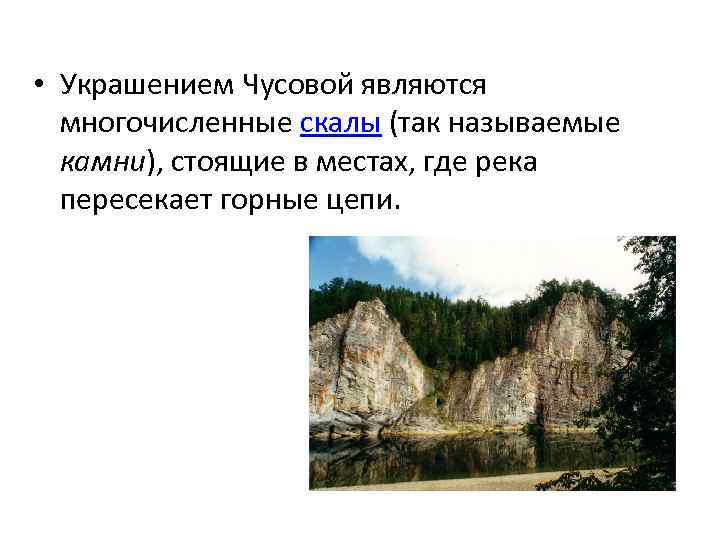 • Украшением Чусовой являются многочисленные скалы (так называемые камни), стоящие в местах, где река пересекает горные цепи.