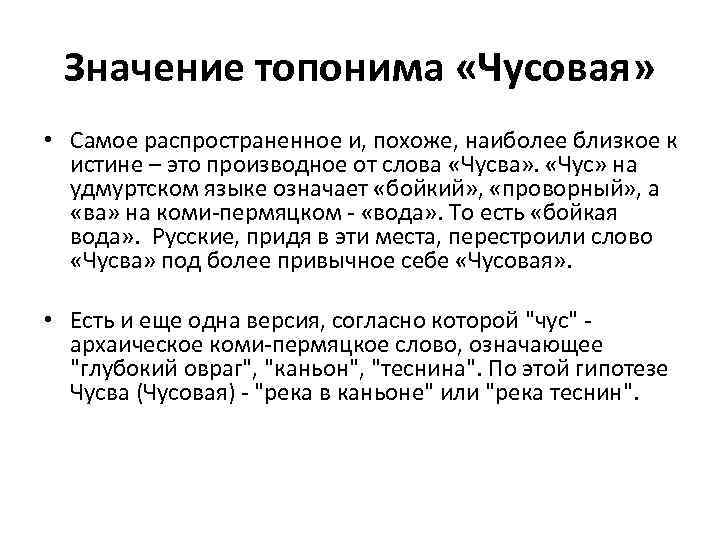 Значение топонима «Чусовая» • Самое распространенное и, похоже, наиболее близкое к истине – это производное от слова «Чусва» . «Чус» на удмуртском языке означает «бойкий» , «проворный» , а «ва» на коми-пермяцком - «вода» . То есть «бойкая вода» . Русские, придя в эти места, перестроили слово «Чусва» под более привычное себе «Чусовая» . • Есть и еще одна версия, согласно которой "чус" - архаическое коми-пермяцкое слово, означающее "глубокий овраг", "каньон", "теснина". По этой гипотезе Чусва (Чусовая) - "река в каньоне" или "река теснин".