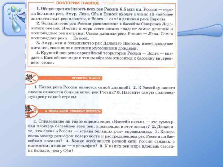 Характеристика Названия рек Бассейн Тихого океана. Около 20% территории страны. Область внутреннего стока. Менее 10% территории страны. Амур, Анадырь, Аргунь, Камчатка и другие. Волга, Урал, Терек и другие. Многие имеют небольшую протяженность и отличаются большой скоростью течения. Реки Чукотки имеют снеговое питание, реки, текущие в условиях муссонного климата, - дождевое. Летние паводки, связанные с действием муссонов. Все впадают в Каспийское море. Бассейн реки Волги занимает 30% территории Восточно- Европейской равнины; имеют преимущественно снеговое питание; весенние половодья и зарегулированный гидроплотинами сток. Река