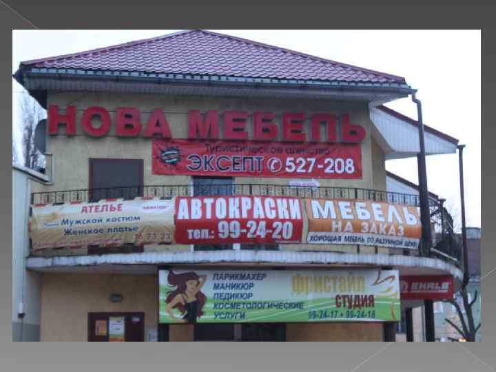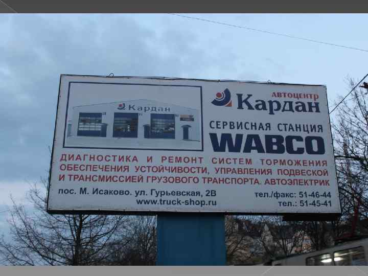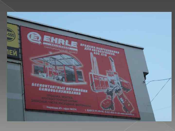 Билборд Адрес –ул. Яналова Сторона А Статичная конструкция Композиция – сухая реклама Есть логотип, слогана нет Ясна предлагаемая услуга Большое кол-во текста, которое не успеваешь прочитать Шрифт – 3 шрифта, 2 цвета Есть контактные данные Оценка - 3