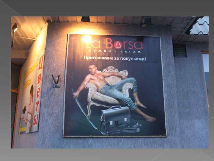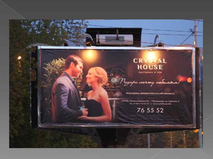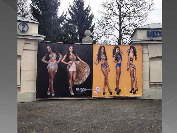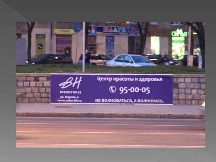 Банер Адрес – пр-кт Мира (Стадион «Балтика» ) Статичная конструкция Композиция – образ-вампир Используется логотип, но если не знаешь логотип чего, то и непонятно Слогана нет Шрифт - 1 Привлекают внимание за счёт моделей Демонстрация ЦА Нет никакой информации об услуги Оценка - 4