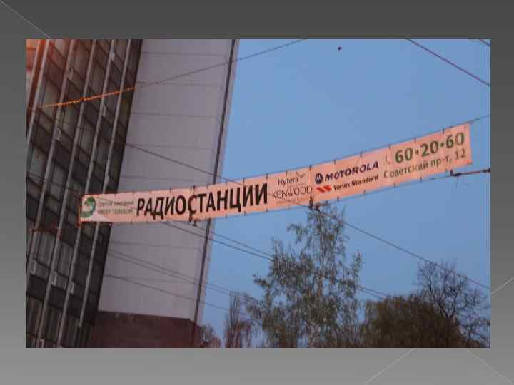 Растяжка Адрес – Советский проспект 1 Сторона А Статичная конструкция Используются логотип (ясна марка), но много и непонятно к чему Нет слогана Не ясна услуга Есть контактные данные Не улавливается связь между «Радиостанции» и логотипами фирм «-» – не особо привлекает внимание Оценка - 2