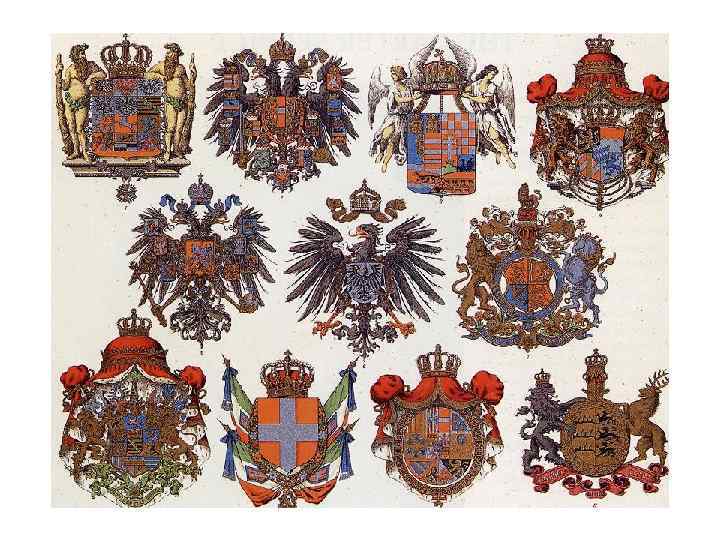 Изображения на гербах • Гербы создавались строго по правилам, описывались с помощью специальных терминов. • На гербах фигурировали разные изображения: звери (реальные или фантастические), предметы воинского вооружения и снаряжения – стрелы, копья, мечи, топоры и т. д. Нидерланды Австрия Испания