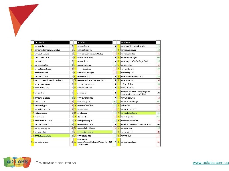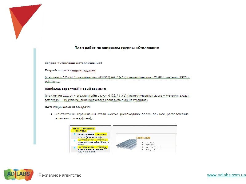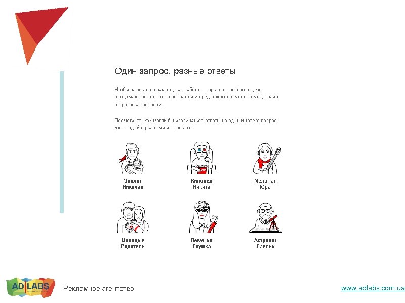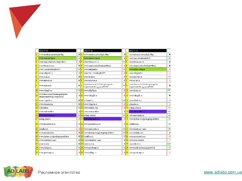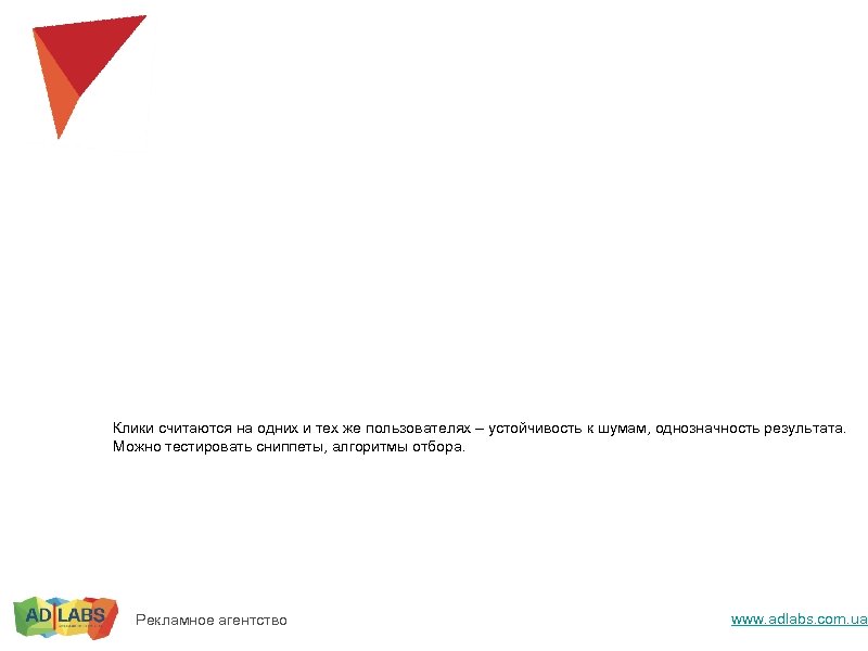 Клики считаются на одних и тех же пользователях – устойчивость к шумам, однозначность результата. Можно тестировать сниппеты, алгоритмы отбора. Рекламное агентство www. adlabs. com. ua