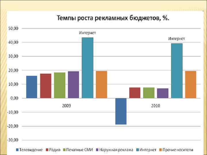 Носитель Плюсы Минусы Телевидение · Низкая стоимость контакта · Необходимость показа · Скорее да, чем нет. рекламы несколько раз, чтобы Несмотря на рост цен, пока гарантировать просмотры остается отличным решением рекламы по критерию «цена/охват» · Аудиовизуальная подача информации · Огромный охват · Более молодая аудитория уходит в интернет. · Относительно невысокая стоимость размещения · Отсутствие визуальной составляющей · Доспупность многим слоям населения Радио · Сложная оценка эффективности Подходит для кризиса? Наружная реклама · Возможность географической · Довольно высокая локализации стоимость размещения · Рекламу видят те, кому не доступны другие форматы · В меньшей степени. Зависит от задач рекламодателя. · Только при условии адекватных цен на носители · Крайне сложная оценка эффективности Сложная и приблизительная · В меньшей степени. оценка эффективности Зависит от задач · Большое количество рекламодателя конкурентнов в одном · Тематический и геотаргетинг издании, из-за чего снижается запоминаемость рекламы · Ненавязчивость Печатная реклама · Неограниченный контакт с рекламой в случае заинтересованности Интернет-реклама · Возможность таргетирования Охват ограничен сообщений проникновением интернета · Понятная отчетность · Прозрачные способы замера эффективности · В большей степени, чем другие форматы. . По прогнозам компании Zenith. Optimedia Russia в 2009 году