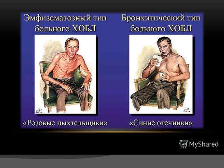 Вид больного с ХОБЛ Губы собраны «трубочкой» , Окраска кожных покровов - сочетание гипоксии, гиперкапнии и эритроцитоза. Диффузный цианоз различной интенсивности обычно служит проявлением гипоксемии. «Пальцы Гиппократа» .