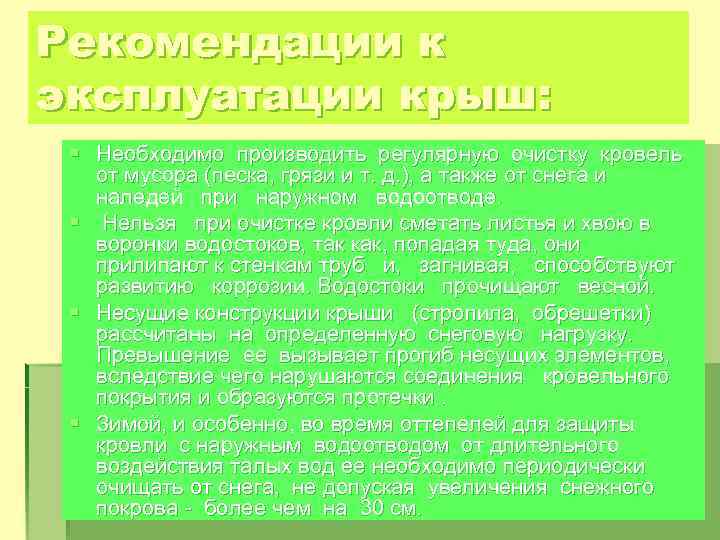 Рекомендации к эксплуатации крыш: § Необходимо производить регулярную очистку кровель от мусора (песка, грязи и т. д. ), а также от снега и наледей при наружном водоотводе. § Нельзя при очистке кровли сметать листья и хвою в воронки водостоков, так как, попадая туда, они прилипают к стенкам труб и, загнивая, способствуют развитию коррозии. Водостоки прочищают весной. § Несущие конструкции крыши (стропила, обрешетки) рассчитаны на определенную снеговую нагрузку. Превышение ее вызывает прогиб несущих элементов, вследствие чего нарушаются соединения кровельного покрытия и образуются протечки. § Зимой, и особенно, во время оттепелей для защиты кровли с наружным водоотводом от длительного воздействия талых вод ее необходимо периодически очищать от снега, не допуская увеличения снежного покрова более чем на 30 см.