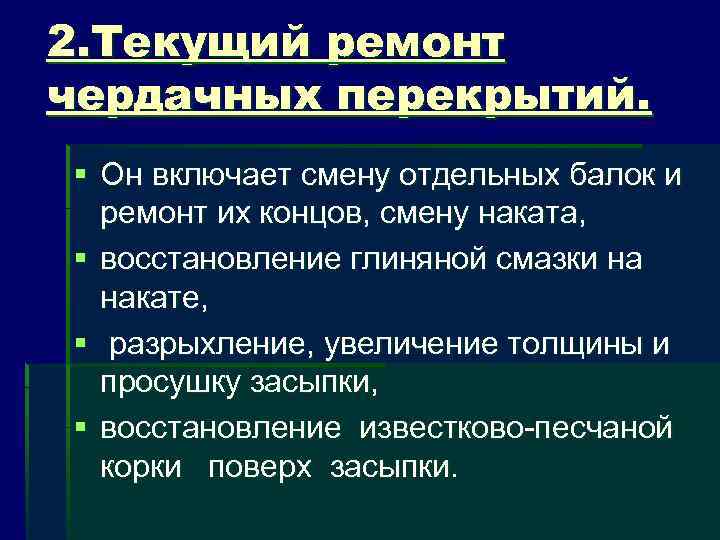 2. Текущий ремонт чердачных перекрытий. § Он включает смену отдельных балок и ремонт их концов, смену наката, § восстановление глиняной смазки на накате, § разрыхление, увеличение толщины и просушку засыпки, § восстановление известково песчаной корки поверх засыпки.