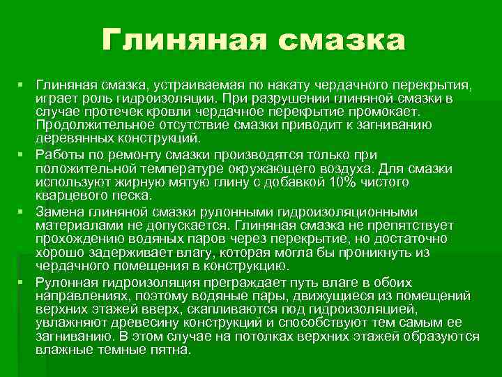 Глиняная смазка § Глиняная смазка, устраиваемая по накату чердачного перекрытия, играет роль гидроизоляции. При разрушении глиняной смазки в случае протечек кровли чердачное перекрытие промокает. Продолжительное отсутствие смазки приводит к загниванию деревянных конструкций. § Работы по ремонту смазки производятся только при положительной температуре окружающего воздуха. Для смазки используют жирную мятую глину с добавкой 10% чистого кварцевого песка. § Замена глиняной смазки рулонными гидроизоляционными материалами не допускается. Глиняная смазка не препятствует прохождению водяных паров через перекрытие, но достаточно хорошо задерживает влагу, которая могла бы проникнуть из чердачного помещения в конструкцию. § Рулонная гидроизоляция преграждает путь влаге в обоих направлениях, поэтому водяные пары, движущиеся из помещений верхних этажей вверх, скапливаются под гидроизоляцией, увлажняют древесину конструкций и способствуют тем самым ее загниванию. В этом случае на потолках верхних этажей образуются влажные темные пятна.