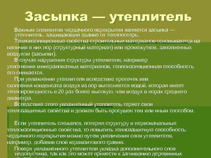 Засыпка — утеплитель Важным элементом чердачного перекрытия является засыпка — утеплитель, защищающий здание от теплопотерь. Теплоизоляционные свойства строительных материалов основываются на наличии в них пор (структурный материал) или промежутков, заполненных воздухом (засыпки). В случае нарушения структуры утеплителя, например уплотнения минераловатных материалов, теплоизоляционная способность его снижается. При увлажнении утеплителя вследствие протечек или скопления конденсата воздух из пор вытесняется водой, которая имеет теплопроводность в 20 раз более высокую, чем воздух в порах среднего диаметра. Вследствие этого увлажненный утеплитель теряет свои теплозащитные свойства и должен быть просушен тем или иным способом. Если утеплитель слежался, потерял структуру и первоначальные теплоизоляционные свойства, то повысить теплозащитную способность чердачного перекрытия можно путем увеличения слоя утеплителя, например, добавив слой керамзитового гравия. Поверх увлажненного утеплителя укладка дополнительного слоя недопустима, так как это может привести к загниванию деревянных