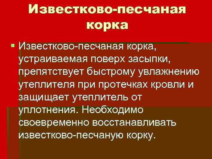 Известково-песчаная корка § Известково песчаная корка, устраиваемая поверх засыпки, препятствует быстрому увлажнению утеплителя при протечках кровли и защищает утеплитель от уплотнения. Необходимо своевременно восстанавливать известково песчаную корку.