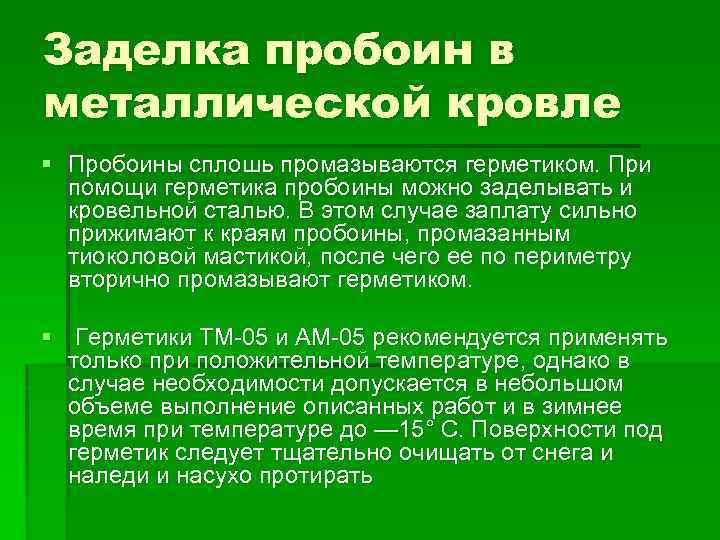 Заделка пробоин в металлической кровле § Пробоины сплошь промазываются герметиком. При помощи герметика пробоины можно заделывать и кровельной сталью. В этом случае заплату сильно прижимают к краям пробоины, промазанным тиоколовой мастикой, после чего ее по периметру вторично промазывают герметиком. § Герметики ТМ 05 и АМ 05 рекомендуется применять только при положительной температуре, однако в случае необходимости допускается в небольшом объеме выполнение описанных работ и в зимнее время при температуре до — 15° С. Поверхности под герметик следует тщательно очищать от снега и наледи и насухо протирать