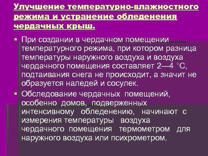 Улучшение температурно-влажностного режима и устранение обледенения чердачных крыш. § При создании в чердачном помещении температурного режима, при котором разница температуры наружного воздуха и воздуха чердачного помещения составляет 2— 4 °С, подтаивания снега не происходит, а значит не образуется наледей и сосулек. § Обследование чердачных помещений, особенно домов, подверженных интенсивному обледенению, начинают с измерения температуры воздуха чердачного помещения термометром для наружного воздуха или психрометром.