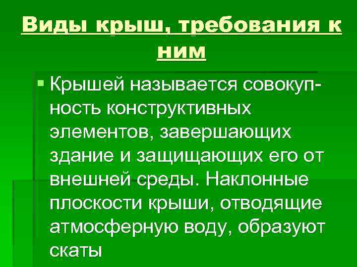 Виды крыш, требования к ним § Крышей называется совокуп ность конструктивных элементов, завершающих здание и защищающих его от внешней среды. Наклонные плоскости крыши, отводящие атмосферную воду, образуют скаты