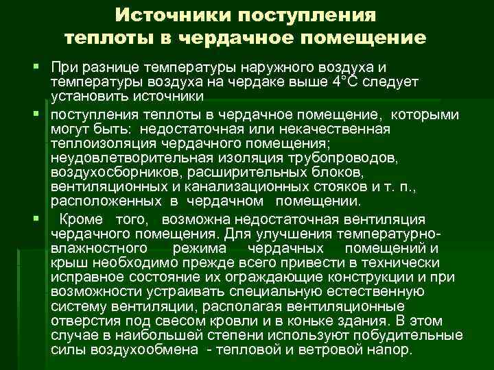 Источники поступления теплоты в чердачное помещение § При разнице температуры наружного воздуха и температуры воздуха на чердаке выше 4°С следует установить источники § поступления теплоты в чердачное помещение, которыми могут быть: недостаточная или некачественная теплоизоляция чердачного помещения; неудовлетворительная изоляция трубопроводов, воздухосборников, расширительных блоков, вентиляционных и канализационных стояков и т. п. , расположенных в чердачном помещении. § Кроме того, возможна недостаточная вентиляция чердачного помещения. Для улучшения температурно влажностного режима чердачных помещений и крыш необходимо прежде всего привести в технически исправное состояние их ограждающие конструкции и при возможности устраивать специальную естественную систему вентиляции, располагая вентиляционные отверстия под свесом кровли и в коньке здания. В этом случае в наибольшей степени используют побудительные силы воздухообмена тепловой и ветровой напор.