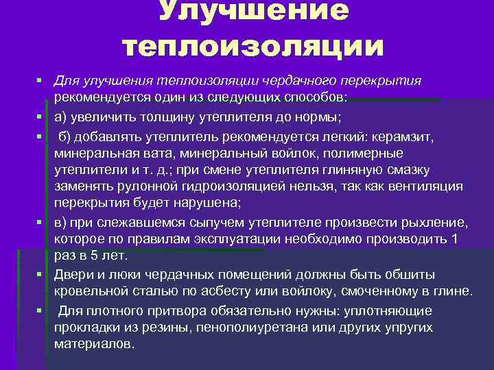 Улучшение теплоизоляции § Для улучшения теплоизоляции чердачного перекрытия рекомендуется один из следующих способов: § а) увеличить толщину утеплителя до нормы; § б) добавлять утеплитель рекомендуется легкий: керамзит, минеральная вата, минеральный войлок, полимерные утеплители и т. д. ; при смене утеплителя глиняную смазку заменять рулонной гидроизоляцией нельзя, так как вентиляция перекрытия будет нарушена; § в) при слежавшемся сыпучем утеплителе произвести рыхление, которое по правилам эксплуатации необходимо производить 1 раз в 5 лет. § Двери и люки чердачных помещений должны быть обшиты кровельной сталью по асбесту или войлоку, смоченному в глине. § Для плотного притвора обязательно нужны: уплотняющие прокладки из резины, пенополиуретана или других упругих материалов.