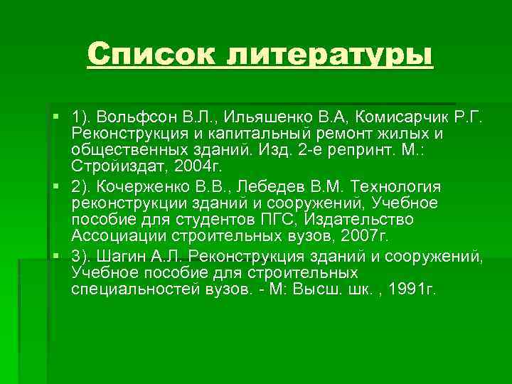 Список литературы § 1). Вольфсон В. Л. , Ильяшенко В. А, Комисарчик Р. Г. Реконструкция и капитальный ремонт жилых и общественных зданий. Изд. 2 е репринт. М. : Стройиздат, 2004 г. § 2). Кочерженко В. В. , Лебедев В. М. Технология реконструкции зданий и сооружений, Учебное пособие для студентов ПГС, Издательство Ассоциации строительных вузов, 2007 г. § 3). Шагин А. Л. Реконструкция зданий и сооружений, Учебное пособие для строительных специальностей вузов. М: Высш. шк. , 1991 г.
