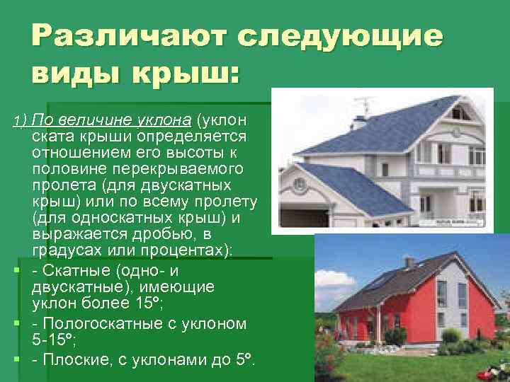 Различают следующие виды крыш: 1) По величине уклона (уклон ската крыши определяется отношением его высоты к половине перекрываемого пролета (для двускатных крыш) или по всему пролету (для односкатных крыш) и выражается дробью, в градусах или процентах): § Скатные (одно и двускатные), имеющие уклон более 15º; § Пологоскатные с уклоном 5 15º; § Плоские, с уклонами до 5º.