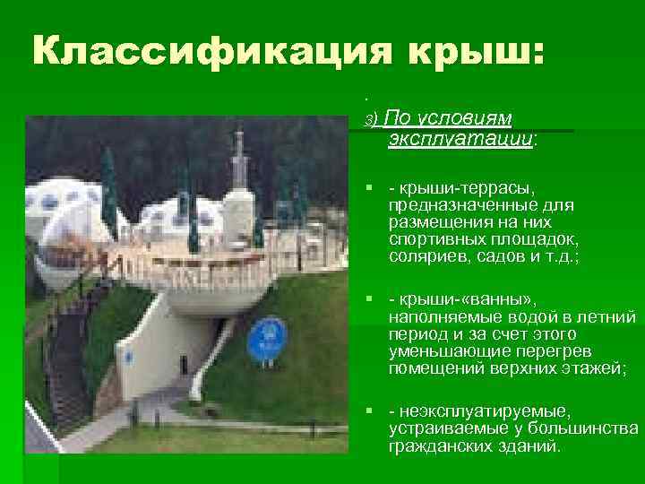 Классификация крыш: . 3) По условиям эксплуатации: § крыши террасы, предназначенные для размещения на них спортивных площадок, соляриев, садов и т. д. ; § крыши «ванны» , наполняемые водой в летний период и за счет этого уменьшающие перегрев помещений верхних этажей; § неэксплуатируемые, устраиваемые у большинства гражданских зданий.