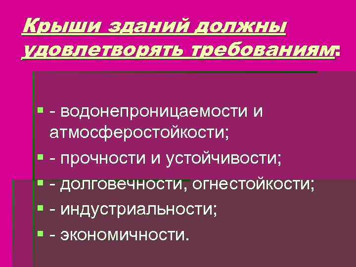 Крыши зданий должны удовлетворять требованиям: § водонепроницаемости и атмосферостойкости; § прочности и устойчивости; § долговечности, огнестойкости; § индустриальности; § экономичности.