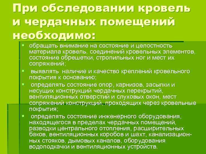 При обследовании кровель и чердачных помещений необходимо: § обращать внимание на состояние и целостность материала кровель, соединений кровельных элементов, состояние обрешетки, стропильных ног и мест их сопряжений; § выявлять наличие и качество креплений кровельного покрытия к основанию; § определять состояние опор, карнизов, засыпки и несущих конструкций чердачных перекрытий, вентиляционных отверстий и слуховых окон, мест сопряжений конструкций, проходящих через кровельные покрытия; § определять состояние инженерного оборудования, находящегося в пределах чердачных помещений, разводки центрального отопления, расширительных баков, вентиляционных коробов и шахт, канализацион ных стояков, дымовых каналов, оборудования водоподкачки и вентиляционных устройств.