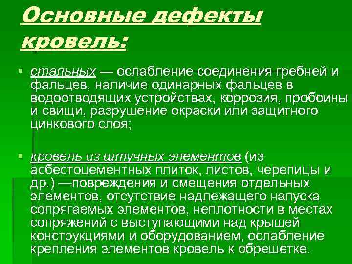 Основные дефекты кровель: § стальных — ослабление соединения гребней и фальцев, наличие одинарных фальцев в водоотводящих устройствах, коррозия, пробоины и свищи, разрушение окраски или защитного цинкового слоя; § кровель из штучных элементов (из асбестоцементных плиток, листов, черепицы и др. ) —повреждения и смещения отдельных элементов, отсутствие надлежащего напуска сопрягаемых элементов, неплотности в местах сопряжений с выступающими над крышей конструкциями и оборудованием, ослабление крепления элементов кровель к обрешетке.
