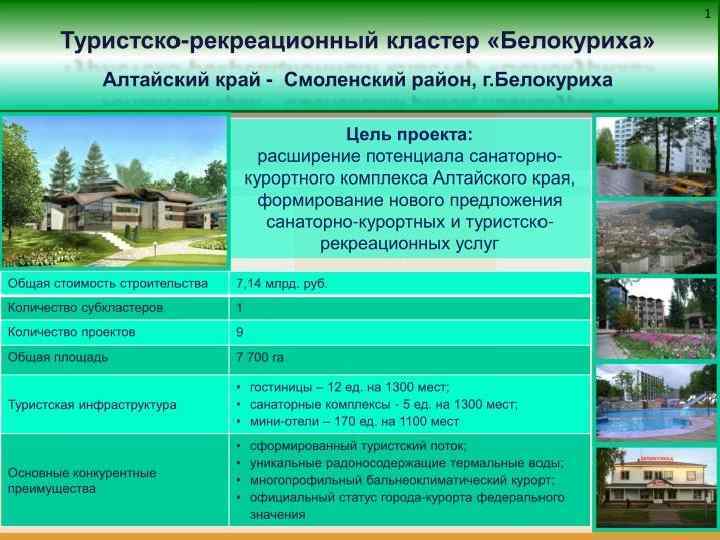 ОЭЗ ТРТ «Бирюзовая Катунь» Алтайский край Общая площадь — 3 326, 3 га Срок действия - 49 лет Инвестиции: запланированные – 8, 2 млрд. руб. осуществленные – 1, 7 млрд. руб. Зарегистрировано 17 компаний Приоритетные направления: Гостиничный бизнес, общественное питание, туристскоэкскурсионное обслуживание, спортивно-оздоровительные услуги