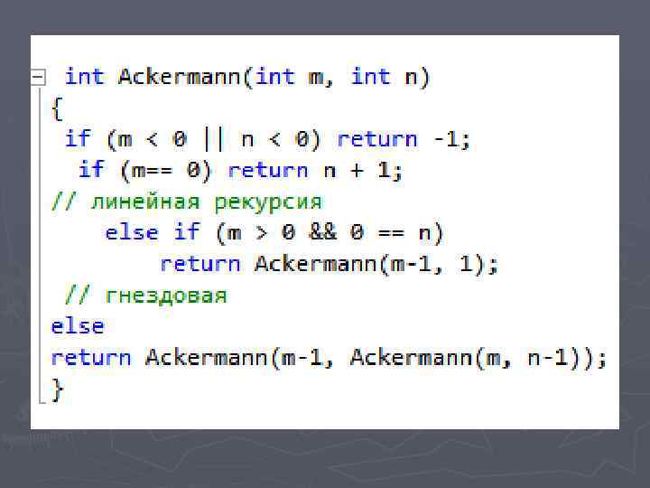 рекурсивная функция int ackr( int n, int x, int y) { int z; int smacc( int, int); if(n==0 || y==0) z=smacc(n, x); else { z=ackr(n, x, y-1); z=ackr(n-1, z, x); } return z; }