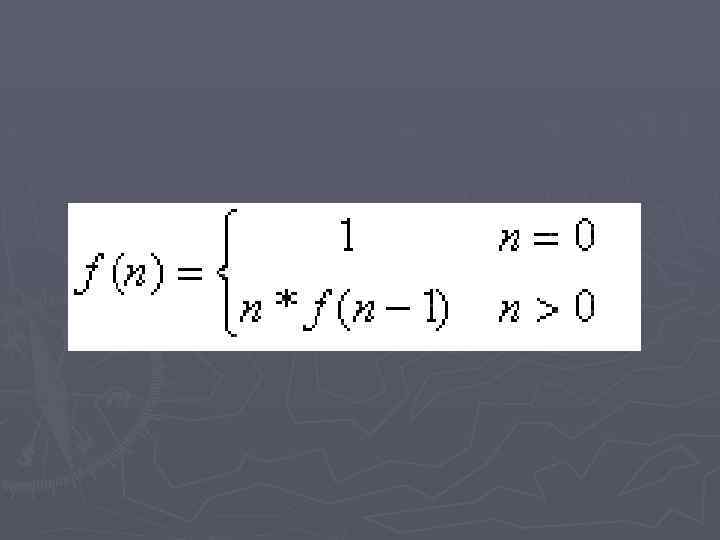 Пример функция Аккермана + X+1, если N=0 | X, если N=1, Y=0, | 0, если N=2, Y=0, A(N, X, Y)= | 1, если N=3, Y=0, | 2, если N=>4, Y=0, + A(N-1, A(N, X, Y-1), X), если N#0, Y#0; где N, X, Y - целые неотрицательные числа.