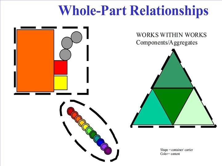 Relationships • Inherent to the model – Among the entities in Group 1 – Across entities in the various groups (roles, subjects) • Content relationships – – – Equivalent Derivative Descriptive Whole/Part to part (sequential) – Accompanying – Shared characteristic