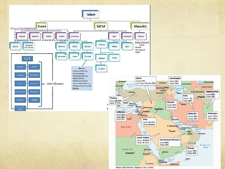 Islam 2 nd largest universalizing religion World’s fastest growing religion 1. 3 billion people Branches Sunni 83 % of Muslims Middle East, Asia “people following the example of Muhammad” Founder Muhammad Succession of Muhammad From the community 622 C. E. Shiite Origin Arabian Peninsula, Middle East Doctrine 16% of Muslims Iran, Iraq, Pakistan, Azerbaijan, Oman, and Bahrain Word for “sectarian” Succession of Muhammad 5 Pillars of Islam Must come from familial line of Muhammad Allah one true God Prayer 5 x a day facing Mecca Charity Fast during Ramadan Hajj- Pilgrimage to Mecca Diffusion Military conquest after Muhammad’s death Then relocation diffusion through missionaries Ex. North Africa Ex. Indonesia- Arab traders