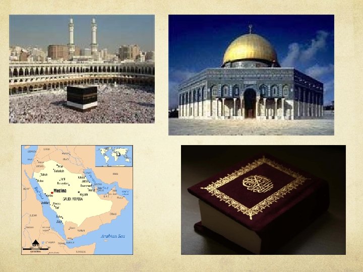 Islam Holy Book Administration Local autonomy The Quran No formal religious hierarchy Holy Places Mecca Birthplace of Muhammad Secular states Calendar Lunar calendar Medina 30 year cycle Muhammad's tomb 19 years with 354 days Jerusalem 11 years with 355 days Muhammad’s ascension Holidays Holy month of Ramadan Landscape Impact Mosques Central, open-air courtyard Minaret tower Cemeteries- Burial of dead Art Calligraphy Geometric design