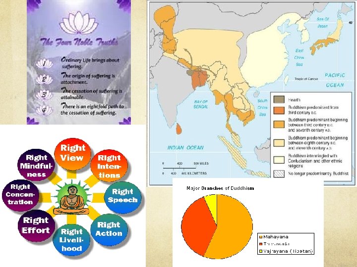 Buddhism 3 rd largest universalizing religion Difficult to gage number Can be Buddhist and other religion Branches Mahayana 56 % 400 million adherents China, Japan, Korea China, SE Asia Split from Theravada 2000 years ago Less demanding Founder Siddhartha Gautama 563 B. C. E. Origin More encompassing Theravada 38% Cambodia, Laos, Myanmar, Sri Lanka, Thailand Oldest branch “way of the elders” India/ Nepal Doctrine Four noble truths 8 -fold path Full-time occupation, monks Tibetan 6% Tibet and Mongolia Diffusion No rapid diffusion Emperor Asoka 273 - 232 B. C. E. Trade routes brought it to China