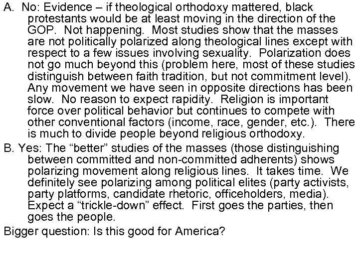 A. No: Evidence – if theological orthodoxy mattered, black protestants would be at least moving in the direction of the GOP. Not happening. Most studies show that the masses are not politically polarized along theological lines except with respect to a few issues involving sexuality. Polarization does not go much beyond this (problem here, most of these studies distinguish between faith tradition, but not commitment level). Any movement we have seen in opposite directions has been slow. No reason to expect rapidity. Religion is important force over political behavior but continues to compete with other conventional factors (income, race, gender, etc. ). There is much to divide people beyond religious orthodoxy. B. Yes: The “better” studies of the masses (those distinguishing between committed and non-committed adherents) shows polarizing movement along religious lines. It takes time. We definitely see polarizing among political elites (party activists, party platforms, candidate rhetoric, officeholders, media). Expect a “trickle-down” effect. First goes the parties, then goes the people. Bigger question: Is this good for America?