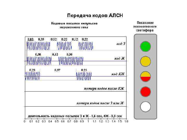 • Зеленому огню - соответствует комбинация, содержащая три импульса тока с длинным интервалом, отделяющим их от таких же трех импульсов следующего сигнала. • Желтому огню — два импульса. • Красному — один импульс. Совокупность таких комбинаций, отличающихся числом импульсов тока, называется числовым кодом