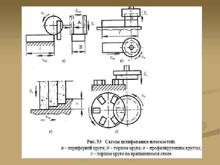 n Шлифование. Как и наружные цилиндрические поверхности деталей типа тел вращения, плоские поверхности обрабатывают шлифованием, полированием и доводкой. Шлифование плоских поверхностей осуществляют на плоскошлифовальных станках с крестовым или круглым столом как обычного исполнения, так и с ЧПУ. Плоское шлифование является одним из основных методов обработки плоскостей деталей машин (особенно закаленных) для достижения требуемого качества. В ряде случаев плоское шлифование может с успехом заменить фрезерование. Шлифование плоских поверхностей может быть осуществлено двумя способами: периферией круга и торцом круга n Полирование поверхностей является методом отделочной обработки. В качестве абразивных инструментов применяют эластичные шлифовальные круги, шлифовальные шкурки. Доводка плоскостей осуществляется на плоскодоводочных станках. Тонкую доводку плоских поверхностей осуществляют притирами. Осуществляют доводку при давлении 20. . . 150 к. Па, причем, чем меньше давление, тем выше качество обработанной поверхности. Скорости при тонкой доводке небольшие (2. . . 10 м/мин). С повышением давления и скорости производительность повышается.