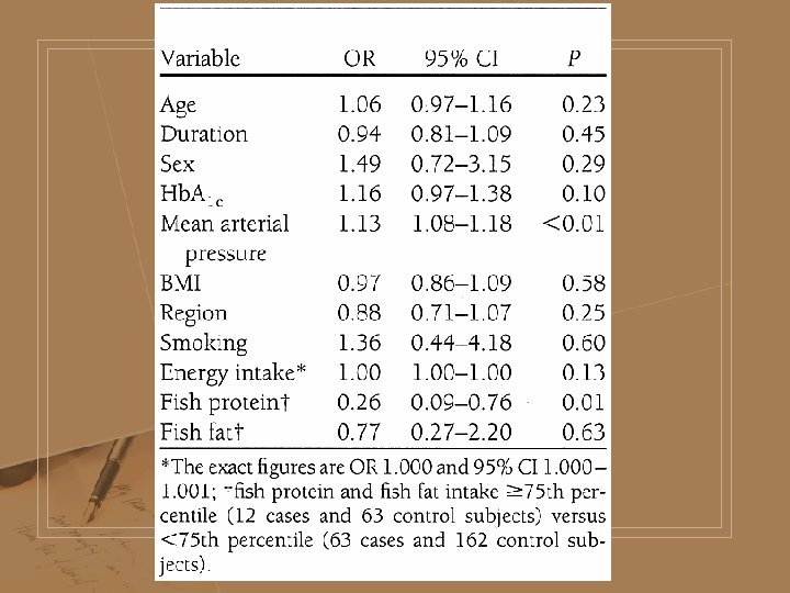 l 在尋求腎病病人的疾病預防 時,發現有一個國外研究指出 (糖尿病照顧雜誌 2001年 5月 24(5)︰ 805 -10) : 魚蛋白質的 攝取在第一型糖尿病的病患 方面可以降低顯微蛋白尿的 危險 。 l 這對於百分之四十會變成尿 毒症的糖尿病族群,具有很大 的保護效果 。