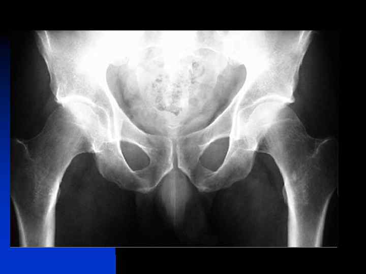 Рентгеновская семиотика остеопороза проксимальных отделов бедренных костей n Остеопороз проксимальных отделов левой бедренной кости 2 ст. по Синху