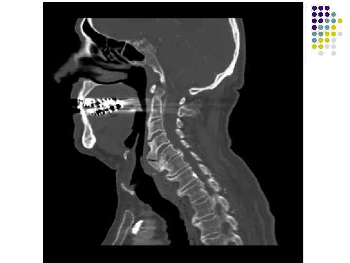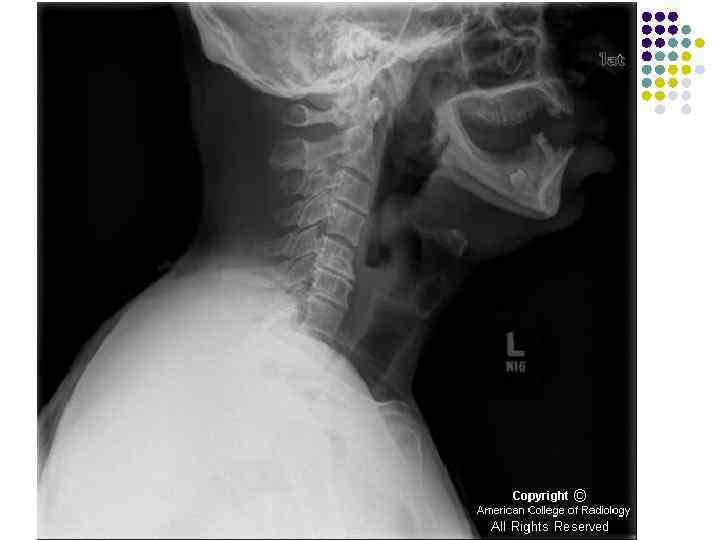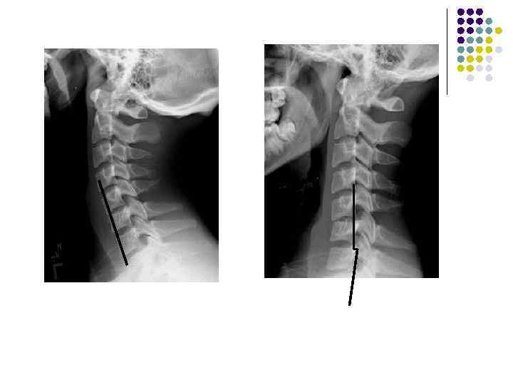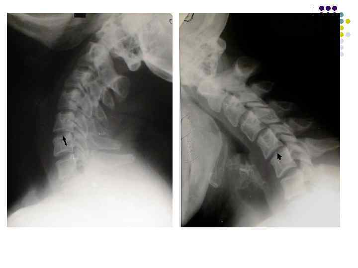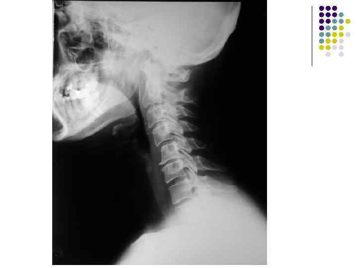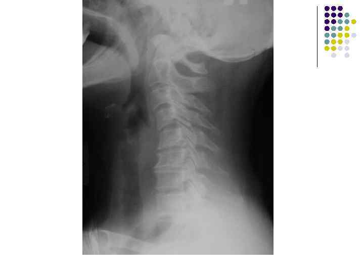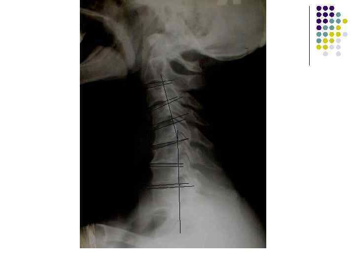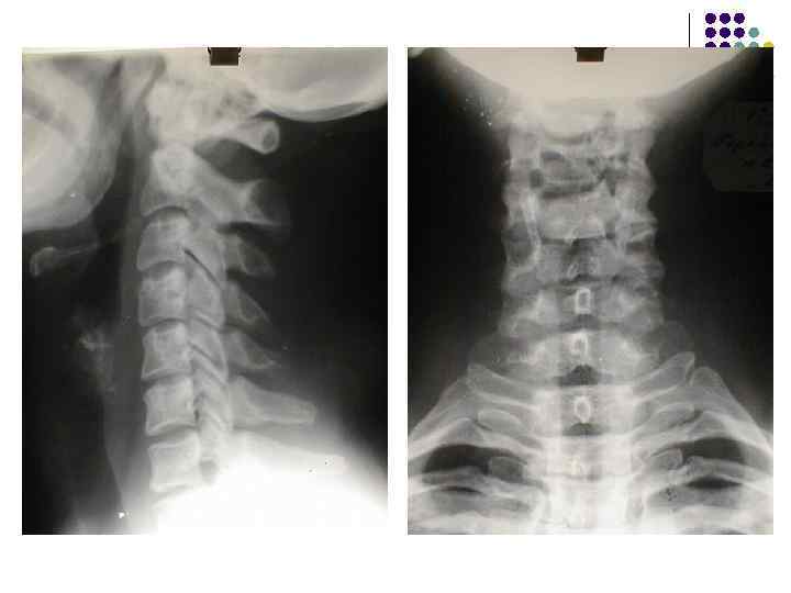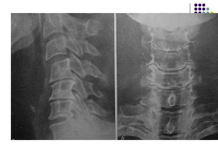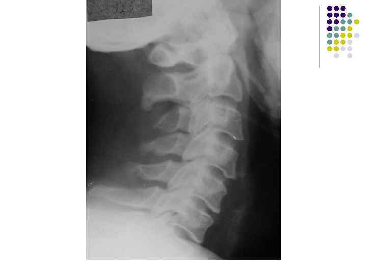 l l l На рентгенограмме шейного отдела позвоночного столба в боковой проекции определяется: выраженные распространенные дистрофические изменения в виде остеохондроза и артроза дугоотростчатых суставов: неравномерное сужение межпозвонковых пространств, субхондральный остеосклероз, костные разрастания по краям тел позвонков, сужение рентгеновских суставных щелей дугоотостчатых суставов с субхондральным остеосклерозом и небольшими костными разрастаниями по краям суставных поверхностей. Наиболее ярко эти изменения выражены в сегментах С 5 -6 -7 Признаки ограниченного смещения тел позвонков в виде симптома «распорки» и кифотической установки. Заключение: Остеохондроз шейного отдела позвоночного столба. Артроз дугоотростчатых суставов. Деформация шейного отдела позвоночника с нарушением статики.