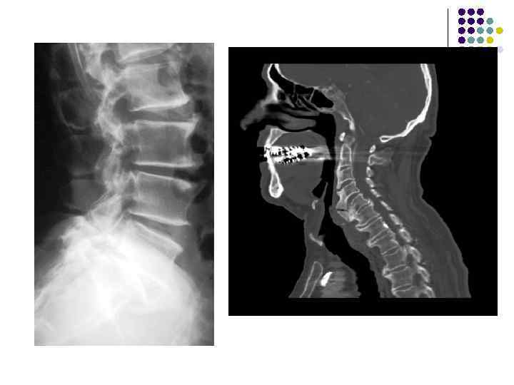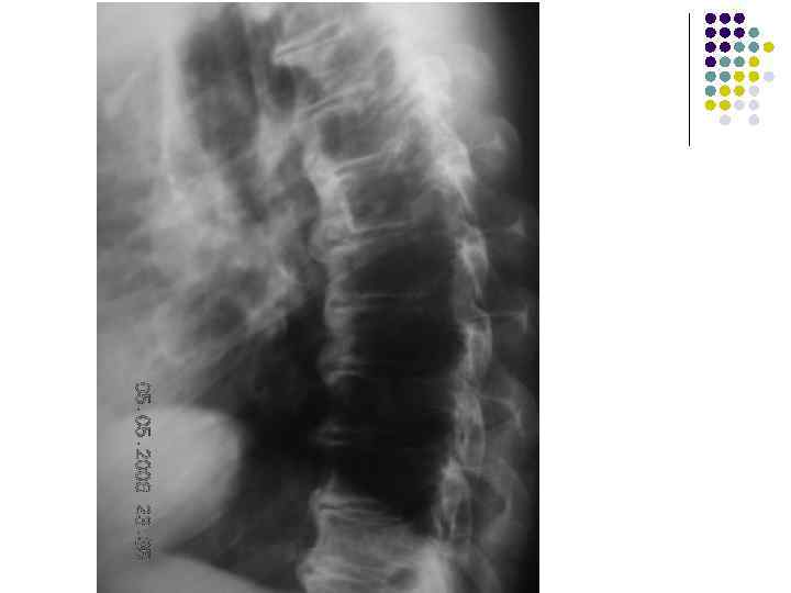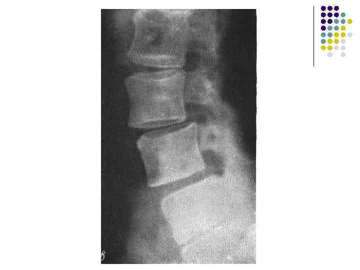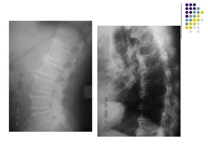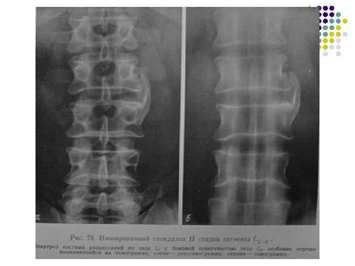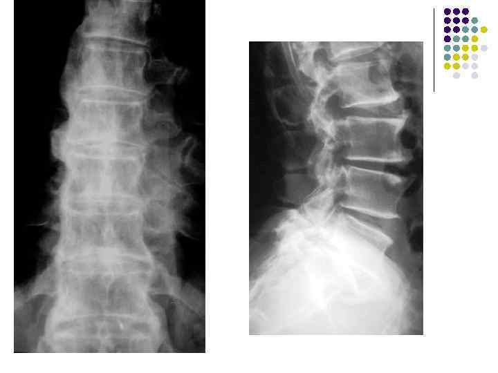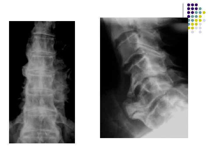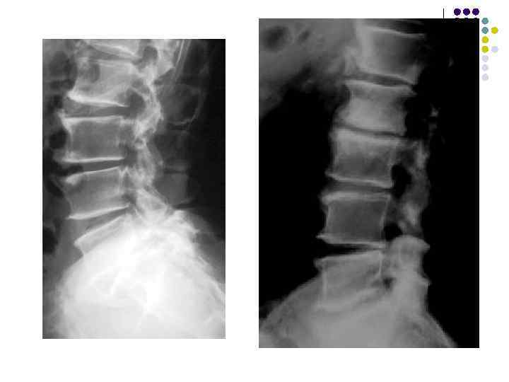 Какие рентгеновские симптомы соответствуют остеохондрозу? l l l 1. Сужение межпозвонковых пространств 2. Деформация передних краев тел позвонков 3. Субхондральный остеосклероз 4. Костные разрастания по краям тел позвонков 5. Признаки листеза тел 6. Обызвествление межпозвонковых дисков 7. Сужение рентгеновских суставных щелей дугоотростчатых суставов 8. Костные разрастания и субхондральный остеосклероз в области дугоотростчатых суставов. 9. Костные разрастания под передней продольной связкой 10. Хрящевые узлы 11. Обызвествления задней продольной связки